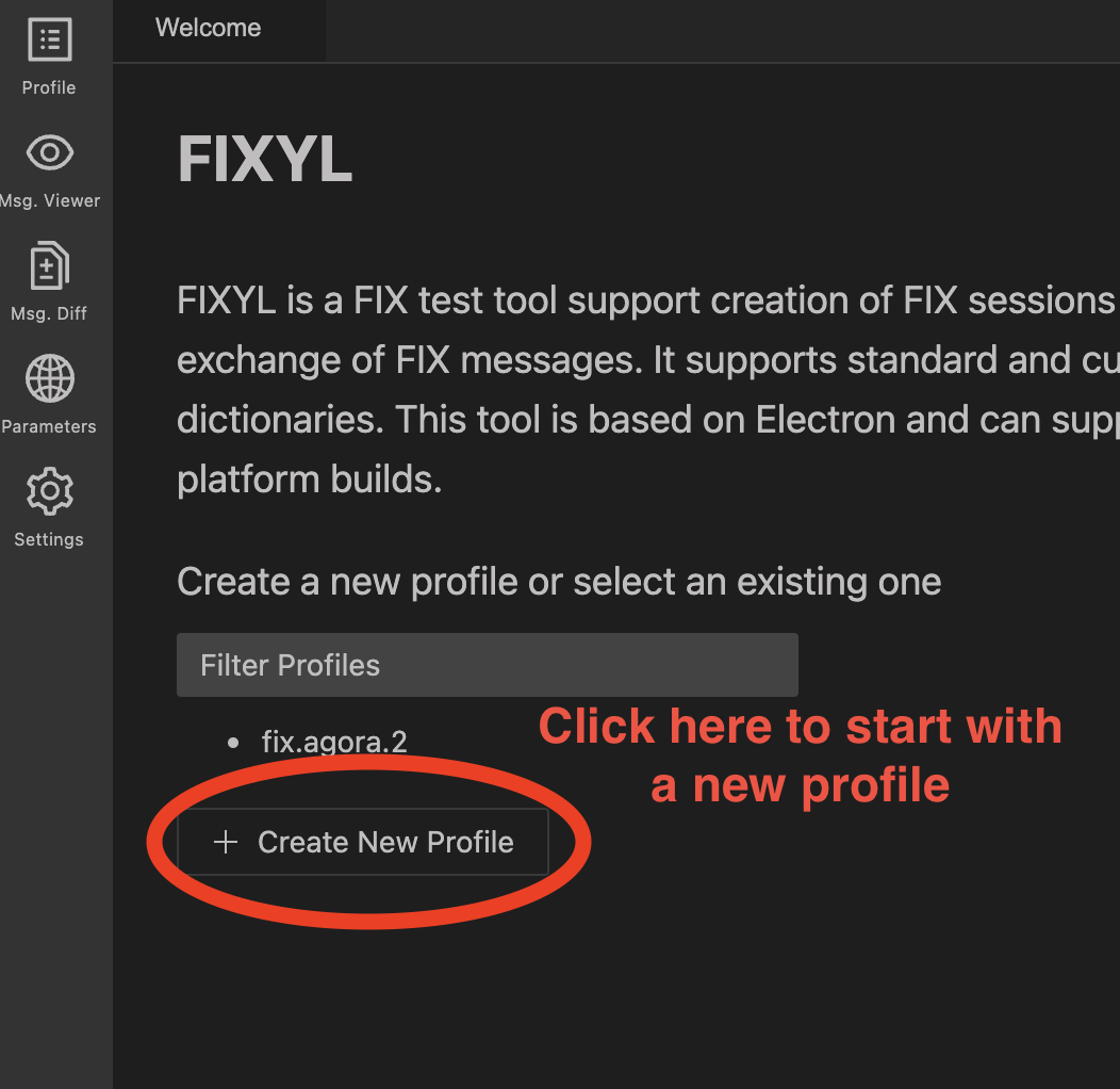 In order to use the FIXYL application to connect to this endpoint, click on + Create New Profile button on the starting page. The following illustration clearly shows the button on the first starting page.