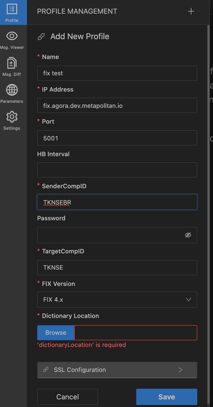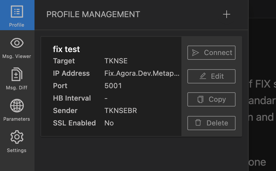 After clicking the new profile button, a sliding form opens from the left. Use the given information above on the FIX endpoint and fill the form. Choose 4.x in the FIX version list. The following picture illustrates a filled form for a new profile called fix test.